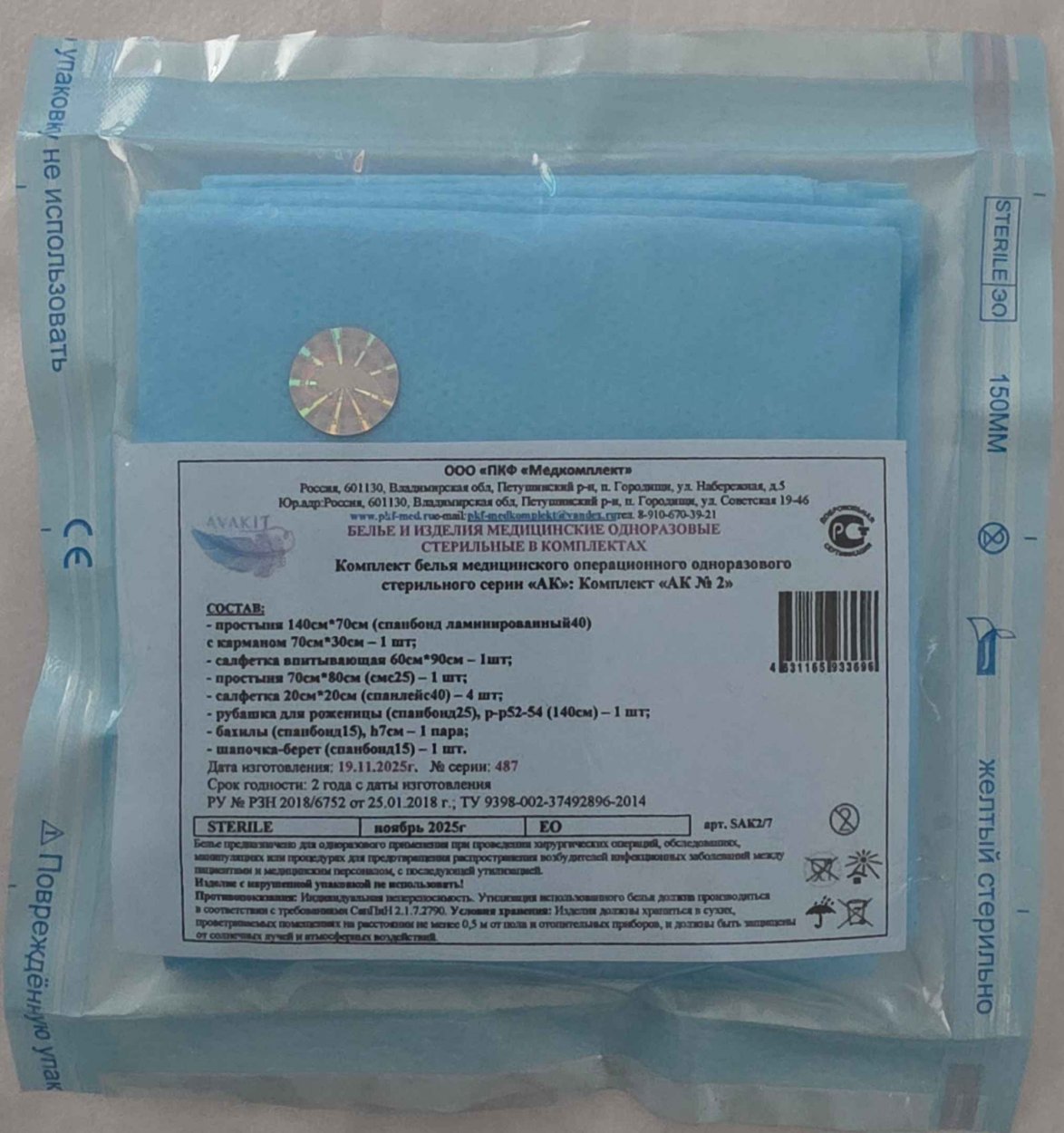 Белье одноразовое медицинское стерильное: Комплект серии «АК №2»